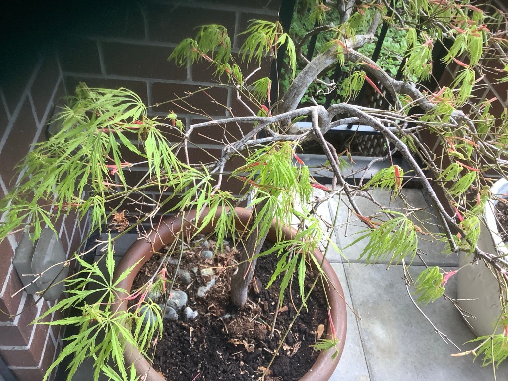Our Japanese Maple is wearing her spring formal. She is a beaut with small bits of pink showing through her green sleeves. I am smitten with her dainty fronds and wistful spirit. She likes to tickle me when I am on the patio with those long branched arms.