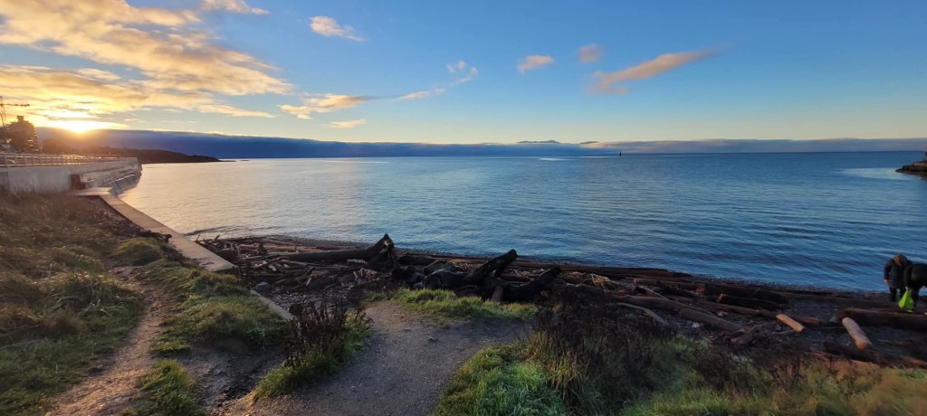 The Breakwater this morning, a stunning sunrise, pink clouds, and black mountain peaks etched with meringue and an otter flipping its tail. The sky’s promise of a beautiful day.