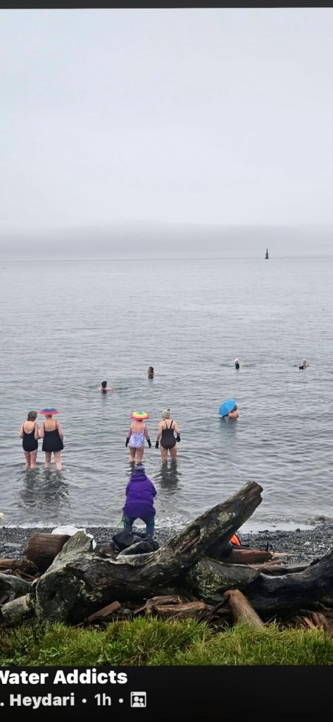 Singing and swimming in the rain in the Salish Sea. I love those head umbrellas! I’m the one in the white toque which is so big that it almost covers my eyes! It was really amazing swimming in the rain which felt warm in comparison to the water. 8 degrees outside and probably about the same in the water. Coffee, toast and peanut butter and good conversation after the swim. A lovely way to begin my day.