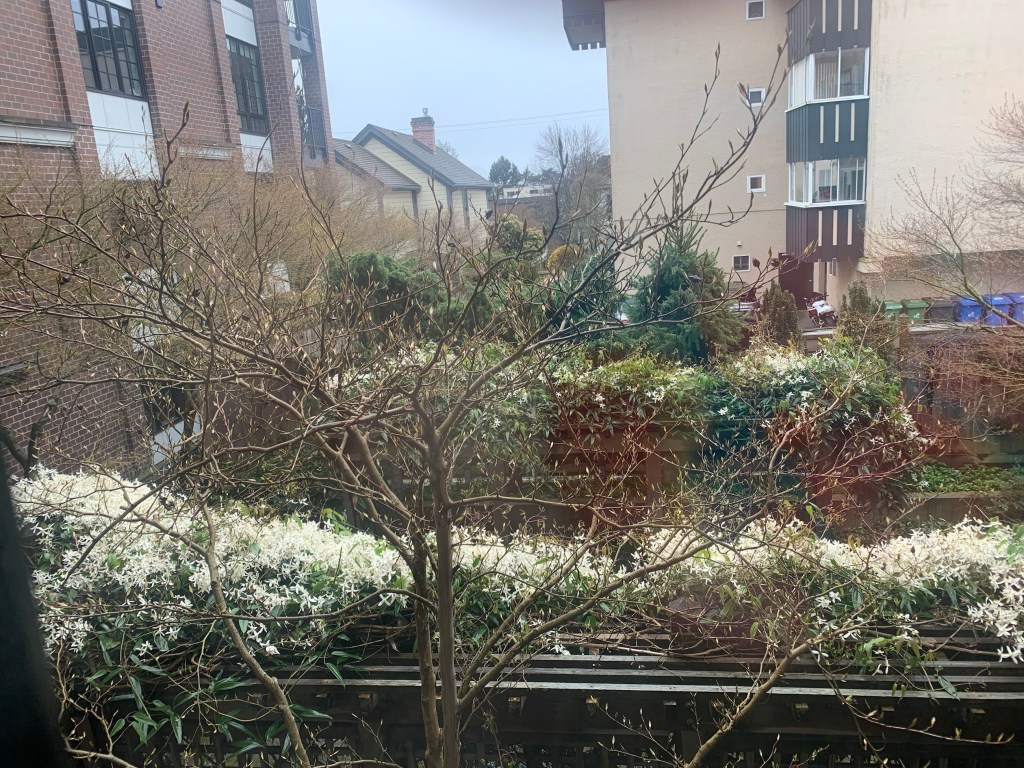 I love creating new collages, with my cats on my desk, and a window with a view of the clematis, and in the far distance the mountains. I’m so lucky to have this little piece of paradise.